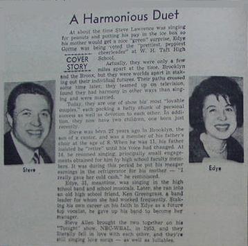 Steve Allen brought the two together on his "Tonight" show, NBC-WBAL, in 1953, and they literally fell in love with each other, and they're still singing love songs - as well as lullabies. |