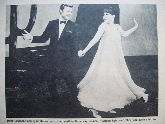 that stars Steve Lawrence and Eydie Gorme. Instead, it was simply a photo-interview session of the pair, who arrived with an entourage that included their pooch, Rocky. The voice heard over the tumult belonged to Eydie. Its insistent, strident tones couldn't be mistaken. Few people can outtalk her. The exuberant, irresistable gal would be tremendous at the United Nations. Not even a Russian veto could silence her. Hubby Steve sums it up nicely: "There really isn't a Steve Lawrence, you know. Eydie's a ventriloquist." While undeniably a great conversationalist, Eydie's an even greater singer. Mention the top five female vocalists around and Eydie has to be up there some place. Few singers possess her range, power, and emotional depth. She can lift a person clear out of his seat with notes similar to the glass-shattering ones she hit on that famed radio-TV commercial: "Plymouth is out to win you over this ye-e-e-e-e-e-ar--eeeh!" Eydie's hubby, Steve, boasts impressive credentials, too. He rates in the upper echelon of crooners, and has sold mountains of records. When Steve says: "I'm a millionaire," he's referring only to his own assets and not to Eydie's equally tall stack of greenbacks. Though each has made it big as a single, it's as a singing duo that they've attracted recent attention. It hasn't mattered whether the pair were headlining The News Harvest Moon Ball shindig or starring on the "Ed Sullivan Show," they've grabbed the audience right from the start. Night club owners classify them among "can't miss" entertainers, an elite category that includes Dean Martin, Frank Sinatra, Sammy Davis Jr. and only a few others. Predictably enough, it's Steve and Eydie's exciting night club tactics that are luring crowds into "Golden Rainbow." The prospect of seeing the pair do a two-hour-plus "act" is reason enough for many people to catch the musical. The pot at the other end of "Rainbow" isn't the pair's sole motivation for doing the show; despite the fact that both have invested in it. "We want to settle down," says Eydie, "and a long running Broadway play is a wonderful way of doing it. Up to now, we've taken our children (David, 8, and Michael, 6) with us on all our night club tours. But both are currently going to school, and I don't think it's a good idea to take them out of it to travel. Besides, we'd like to stay home for a change." "Home" for the Lawrences is a sumptuous 10-room apartment in midtown Manhattan. They marked their 10th anniversary on December 29, and probably spent it recalling how far they both had come since first meeting on Steve Allen's "Tonight" show in 1953. She was a cute kid from the Bronx (E. 168th St.) whose parents were Turkish-born Sephardic Jews. He was the son of a Brooklyn cantor. It wasn't exactly love at first sight when Edith Gormezano gazed at Sidney Liebowitz, but Eydie and Steve gradually warmed toward each other and after four years on the Steve Allen Show, they made it a duet. It was on Allen's program that the pair met Andy Williams. Steve says of his buddy: "When Andy joined the show, he was little more than a rank amateur. He was unsure of himself, and often talked of quitting the business. Today, I consider him the most improved singer around, and couldn't be happier over his success." Steve also speaks frankly about Vic Damone. "He's a tremendous singer today. Vic always had great pipes, but had trouble with his personal life and it affected his singing. Now he has things squared away. He couldn't be better." Eydie is equally forthright when discussing Barbra Streisand, a gal who belts in the same fashion that she does. "Barbra's a wonderful singer, but I think she has to be careful. "There's beginning to be a sameness to her delivery. In other words, it's starting to wear. For example, Barbra recently recorded 'Stout Hearted Men,' using the style she made famous on 'People' and 'Free Again.' I think it was a mistake. The record doesn't do her justice." Eydie believes the current scene has produced exceptionally fine singers. She's an admirer of the Fifth Dimension and the Beatles. "There are also many songs around today that I wish I had had the opportunity to record. I especially liked 'Going Out Of My Head' and 'Downtown,' but the big problem is getting those songs first." And Eydie is extremely eager to come up with winning tunes now that she and Steve have signed a new recording contract with Calendar. Has she given any thought to retiring after 17 years as a professional songbird? "You must be kidding!" Eydie says. But Steve laughingly gets a word in edgewise: "I've thought of it, though" - and then ducks out of range. Cover photo by Harry Warnecke and Gus Schoenbaechler |